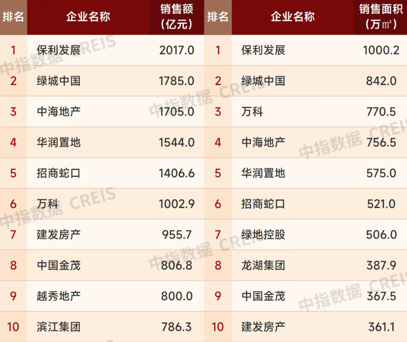 新京报贝壳财经讯 (记者徐倩)今年前三季度,房企销售哪家强?9月30日,中指研究院、克而瑞研究中心分别发布了2025年前9个月房地产企业销售额(全口径)排行榜,其中,保利发展(600048)以2017亿元位居首位,也成为百强房企中唯一一家破2000亿元的房企。
